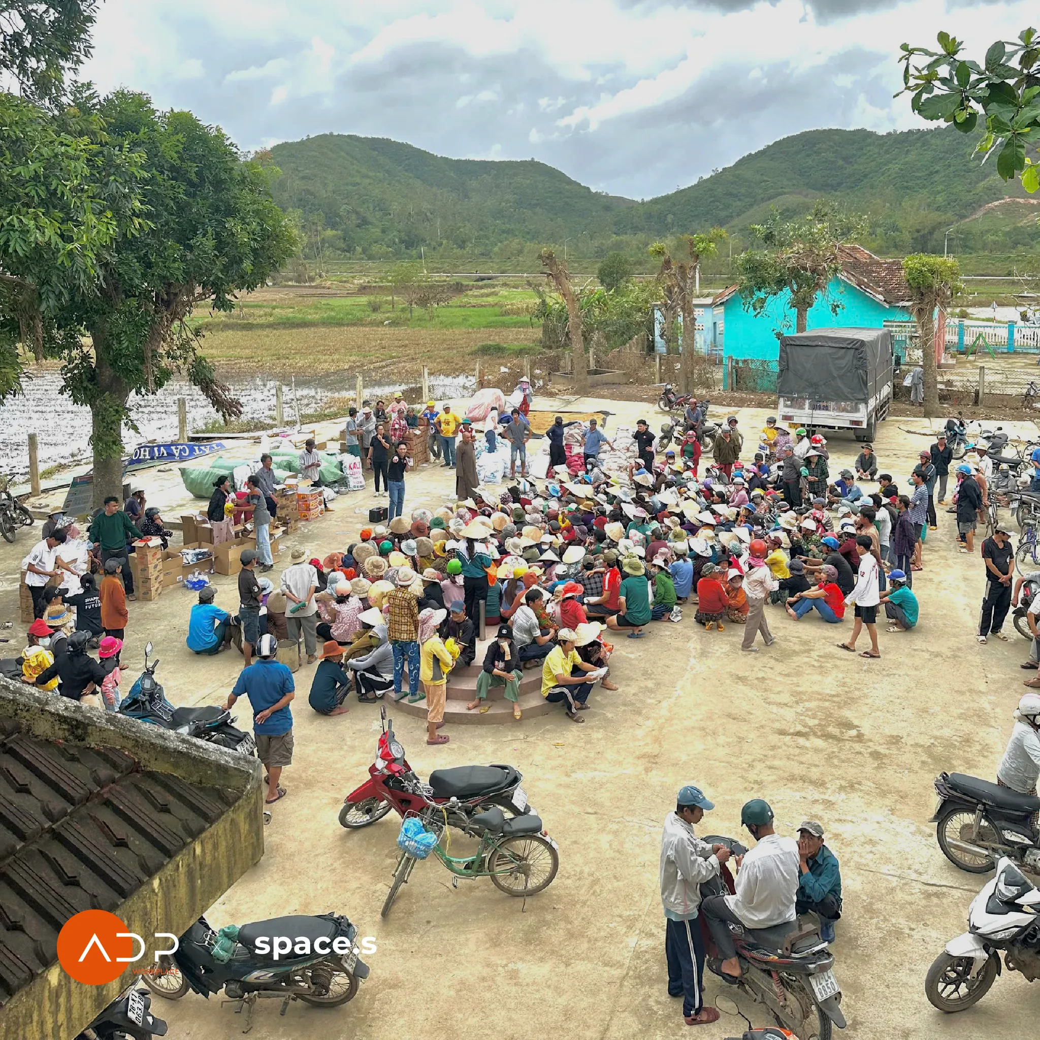 Sáng ngày 4 tháng 12, ADP & Space.s đã di chuyển hàng trăm cây số để đến Thôn Tân Hòa, nơi dấu vết của trận lũ tàn khốc vẫn còn in hằn trên từng mái nhà, từng con đường đất, và trong ánh mắt của những người dân vẫn đang hồi phục sau những ngày tháng gian khổ.
